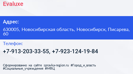Evaluxe по адресу 630005, Новосибирская область, Новосибирск, Писарева, 60 в дальнейшем Организация, размещена в следующих категориях: