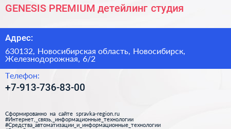 GENESIS PREMIUM, детейлинг-студия по адресу 630132, Новосибирская область, Новосибирск, Железнодорожная, 6/2 в дальнейшем Организация, размещена в следующих категориях: