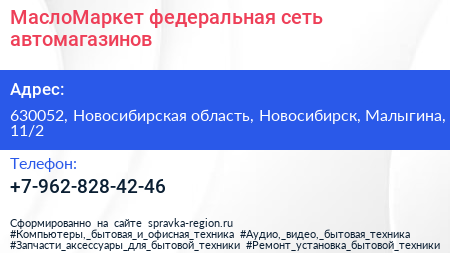 МаслоМаркет, федеральная сеть автомагазинов по адресу 630052, Новосибирская область, Новосибирск, Малыгина, 11/2 в дальнейшем Организация, размещена в следующих категориях: