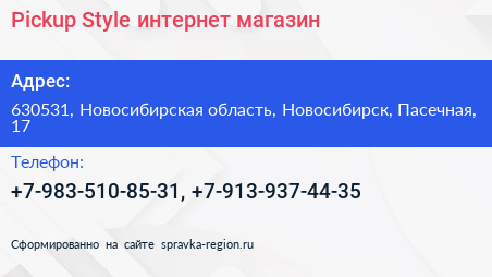 Pickup Style, интернет-магазин по адресу 630531, Новосибирская область, Новосибирск, Пасечная, 17 в дальнейшем Организация, размещена в следующих категориях: