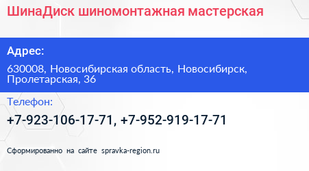 ШинаДиск, шиномонтажная мастерская по адресу 630008, Новосибирская область, Новосибирск, Пролетарская, 36 в дальнейшем Организация, размещена в следующих категориях: