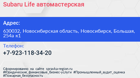 Subaru Life, автомастерская по адресу 630032, Новосибирская область, Новосибирск, Большая, 254а к1 в дальнейшем Организация, размещена в следующих категориях: