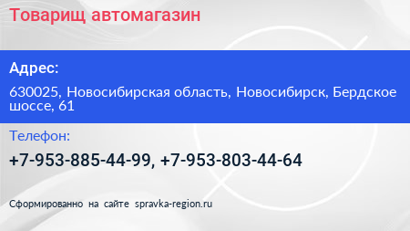 Товарищ, автомагазин по адресу 630025, Новосибирская область, Новосибирск, Бердское шоссе, 61 в дальнейшем Организация, размещена в следующих категориях: