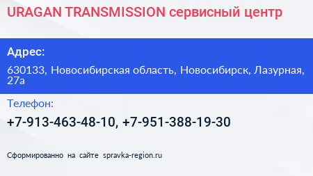 URAGAN TRANSMISSION, сервисный центр по адресу 630133, Новосибирская область, Новосибирск, Лазурная, 27а в дальнейшем Организация, размещена в следующих категориях: