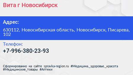 Вита, г. Новосибирск по адресу 630112, Новосибирская область, Новосибирск, Писарева, 102 в дальнейшем Организация, размещена в следующих категориях: