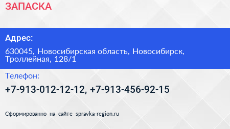 ЗАПАСКА по адресу 630045, Новосибирская область, Новосибирск, Троллейная, 128/1 в дальнейшем Организация, размещена в следующих категориях: