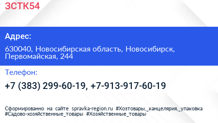 Для связи с организацией воспользуйтесь номером телефона: +7 (383) 299-60-19, +7-913-917-60-19. Пн: c 09:00-18:00, Вт: c 09:00-18:00, Ср: c 09:00-18:00, Чт: c 09:00-18:00, Пт: c 09:00-18:00, Сб: выходной, Вс: выходной, вы можете обратиться в эту организацию.