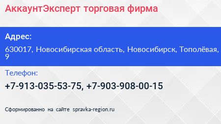 АккаунтЭксперт, торговая фирма по адресу 630017, Новосибирская область, Новосибирск, Тополёвая, 9 в дальнейшем Организация, размещена в следующих категориях: