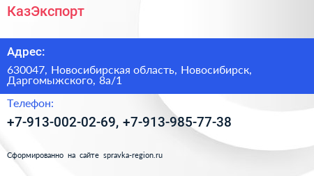 КазЭкспорт по адресу 630047, Новосибирская область, Новосибирск, Даргомыжского, 8а/1 в дальнейшем Организация, размещена в следующих категориях: