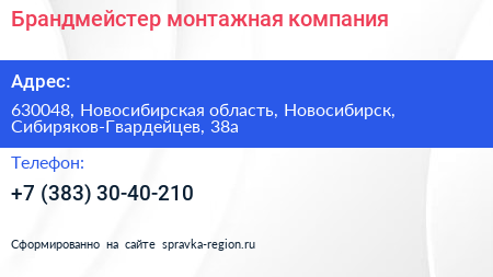 Брандмейстер, монтажная компания по адресу 630048, Новосибирская область, Новосибирск, Сибиряков-Гвардейцев, 38а в дальнейшем Организация, размещена в следующих категориях: