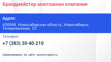 Брандмейстер, монтажная компания по адресу 630048, Новосибирская область, Новосибирск, Телевизионная, 15 в дальнейшем Организация, размещена в следующих категориях: