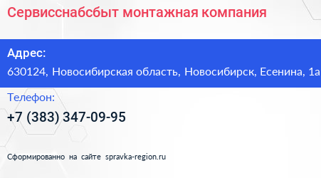 Сервисснабсбыт, монтажная компания по адресу 630124, Новосибирская область, Новосибирск, Есенина, 1а в дальнейшем Организация, размещена в следующих категориях: