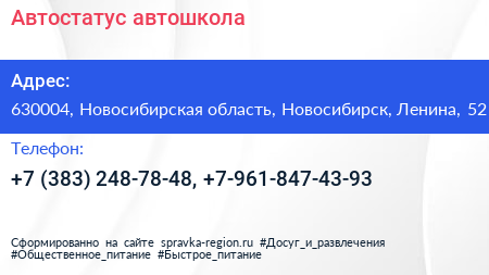 Автостатус, автошкола по адресу 630004, Новосибирская область, Новосибирск, Ленина, 52 в дальнейшем Организация, размещена в следующих категориях: