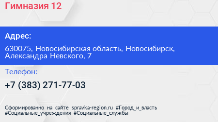 Гимназия №12 по адресу 630075, Новосибирская область, Новосибирск, Александра Невского, 7 в дальнейшем Организация, размещена в следующих категориях: