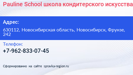 Pauline School, школа кондитерского искусства по адресу 630112, Новосибирская область, Новосибирск, Фрунзе, 242 в дальнейшем Организация, размещена в следующих категориях: