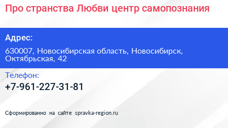 Про-странства Любви, центр самопознания по адресу 630007, Новосибирская область, Новосибирск, Октябрьская, 42 в дальнейшем Организация, размещена в следующих категориях:
