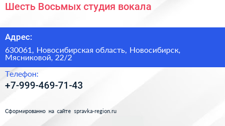 Шесть Восьмых, студия вокала по адресу 630061, Новосибирская область, Новосибирск, Мясниковой, 22/2 в дальнейшем Организация, размещена в следующих категориях: