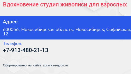 Вдохновение, студия живописи для взрослых по адресу 630056, Новосибирская область, Новосибирск, Софийская, 12 в дальнейшем Организация, размещена в следующих категориях: