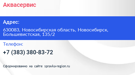 Аквасервис по адресу 630083, Новосибирская область, Новосибирск, Большевистская, 135/2 в дальнейшем Организация, размещена в следующих категориях: