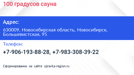 100 градусов, сауна по адресу 630009, Новосибирская область, Новосибирск, Большевистская, 95 в дальнейшем Организация, размещена в следующих категориях: