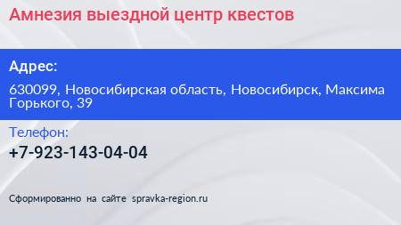 Амнезия, выездной центр квестов по адресу 630099, Новосибирская область, Новосибирск, Максима Горького, 39 в дальнейшем Организация, размещена в следующих категориях: