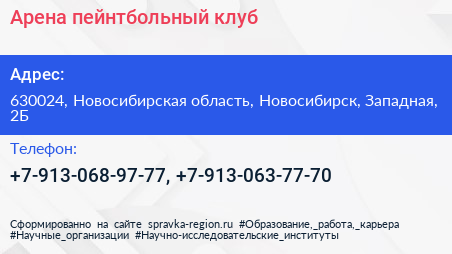 Арена, пейнтбольный клуб по адресу 630024, Новосибирская область, Новосибирск, Западная, 2Б в дальнейшем Организация, размещена в следующих категориях: