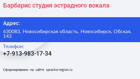 Барбарис, студия эстрадного вокала по адресу 630083, Новосибирская область, Новосибирск, Обская, 143 в дальнейшем Организация, размещена в следующих категориях: