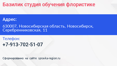 Базилик, студия обучения флористике по адресу 630007, Новосибирская область, Новосибирск, Серебренниковская, 11 в дальнейшем Организация, размещена в следующих категориях: