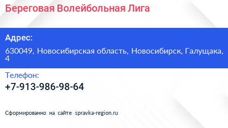Береговая Волейбольная Лига по адресу 630049, Новосибирская область, Новосибирск, Галущака, 4 в дальнейшем Организация, размещена в следующих категориях: