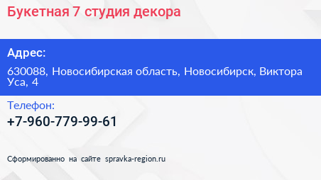 Букетная №7, студия декора по адресу 630088, Новосибирская область, Новосибирск, Виктора Уса, 4 в дальнейшем Организация, размещена в следующих категориях: