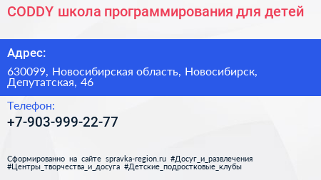 CODDY, школа программирования для детей по адресу 630099, Новосибирская область, Новосибирск, Депутатская, 46 в дальнейшем Организация, размещена в следующих категориях: