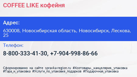 COFFEE LIKE, кофейня по адресу 630008, Новосибирская область, Новосибирск, Лескова, 25 в дальнейшем Организация, размещена в следующих категориях: