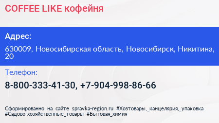 COFFEE LIKE, кофейня по адресу 630009, Новосибирская область, Новосибирск, Никитина, 20 в дальнейшем Организация, размещена в следующих категориях: