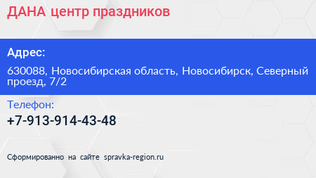 ДАНА, центр праздников по адресу 630088, Новосибирская область, Новосибирск, Северный проезд, 7/2 в дальнейшем Организация, размещена в следующих категориях: