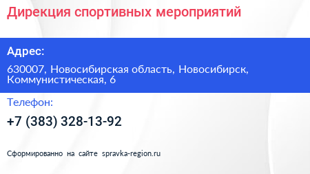 Дирекция спортивных мероприятий по адресу 630007, Новосибирская область, Новосибирск, Коммунистическая, 6 в дальнейшем Организация, размещена в следующих категориях: