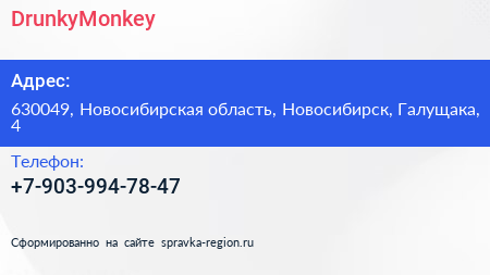 DrunkyMonkey по адресу 630049, Новосибирская область, Новосибирск, Галущака, 4 в дальнейшем Организация, размещена в следующих категориях: