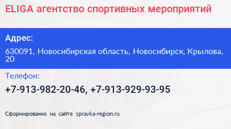 ELIGA, агентство спортивных мероприятий по адресу 630091, Новосибирская область, Новосибирск, Крылова, 20 в дальнейшем Организация, размещена в следующих категориях: