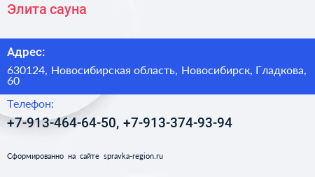 Элита, сауна по адресу 630124, Новосибирская область, Новосибирск, Гладкова, 60 в дальнейшем Организация, размещена в следующих категориях: