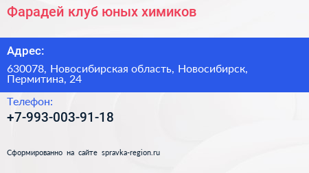 Фарадей, клуб юных химиков по адресу 630078, Новосибирская область, Новосибирск, Пермитина, 24 в дальнейшем Организация, размещена в следующих категориях: