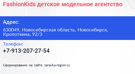 FashionKids, детское модельное агентство по адресу 630049, Новосибирская область, Новосибирск, Кропоткина, 92/3 в дальнейшем Организация, размещена в следующих категориях: