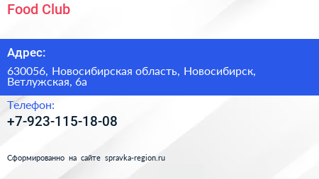 Food Club по адресу 630056, Новосибирская область, Новосибирск, Ветлужская, 6а в дальнейшем Организация, размещена в следующих категориях: