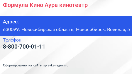 Формула Кино Аура, кинотеатр по адресу 630099, Новосибирская область, Новосибирск, Военная, 5 в дальнейшем Организация, размещена в следующих категориях: