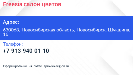 Freesia, салон цветов по адресу 630068, Новосибирская область, Новосибирск, Шукшина, 16 в дальнейшем Организация, размещена в следующих категориях: