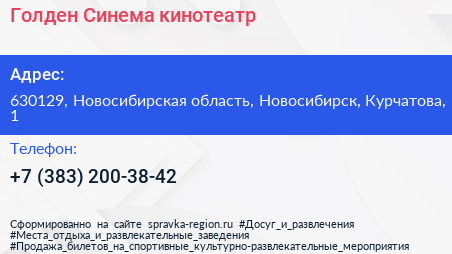 Голден Синема, кинотеатр по адресу 630129, Новосибирская область, Новосибирск, Курчатова, 1 в дальнейшем Организация, размещена в следующих категориях: