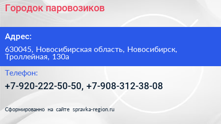 Городок паровозиков по адресу 630045, Новосибирская область, Новосибирск, Троллейная, 130а в дальнейшем Организация, размещена в следующих категориях:
