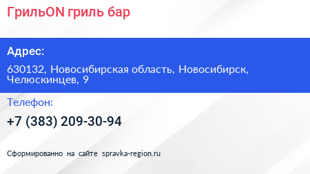 ГрильON, гриль-бар по адресу 630132, Новосибирская область, Новосибирск, Челюскинцев, 9 в дальнейшем Организация, размещена в следующих категориях: