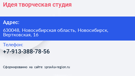 Идея, творческая студия по адресу 630048, Новосибирская область, Новосибирск, Вертковская, 16 в дальнейшем Организация, размещена в следующих категориях: