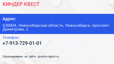 КИНДЕР-КВЕСТ по адресу 630004, Новосибирская область, Новосибирск, проспект Димитрова, 1 в дальнейшем Организация, размещена в следующих категориях: