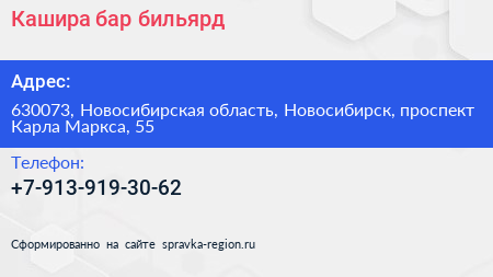 Кашира, бар-бильярд по адресу 630073, Новосибирская область, Новосибирск, проспект Карла Маркса, 55 в дальнейшем Организация, размещена в следующих категориях: