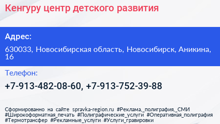 Кенгуру, центр детского развития по адресу 630033, Новосибирская область, Новосибирск, Аникина, 16 в дальнейшем Организация, размещена в следующих категориях: